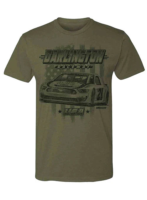 The American flag draped behind a race car makes for the perfect t-shirt!